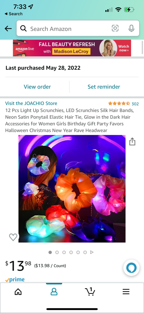 A few months ago I had bought light up scrunches and had worn one to bed. It came out of my hair in the middle of the night and I had rolled over on to it turning it on.